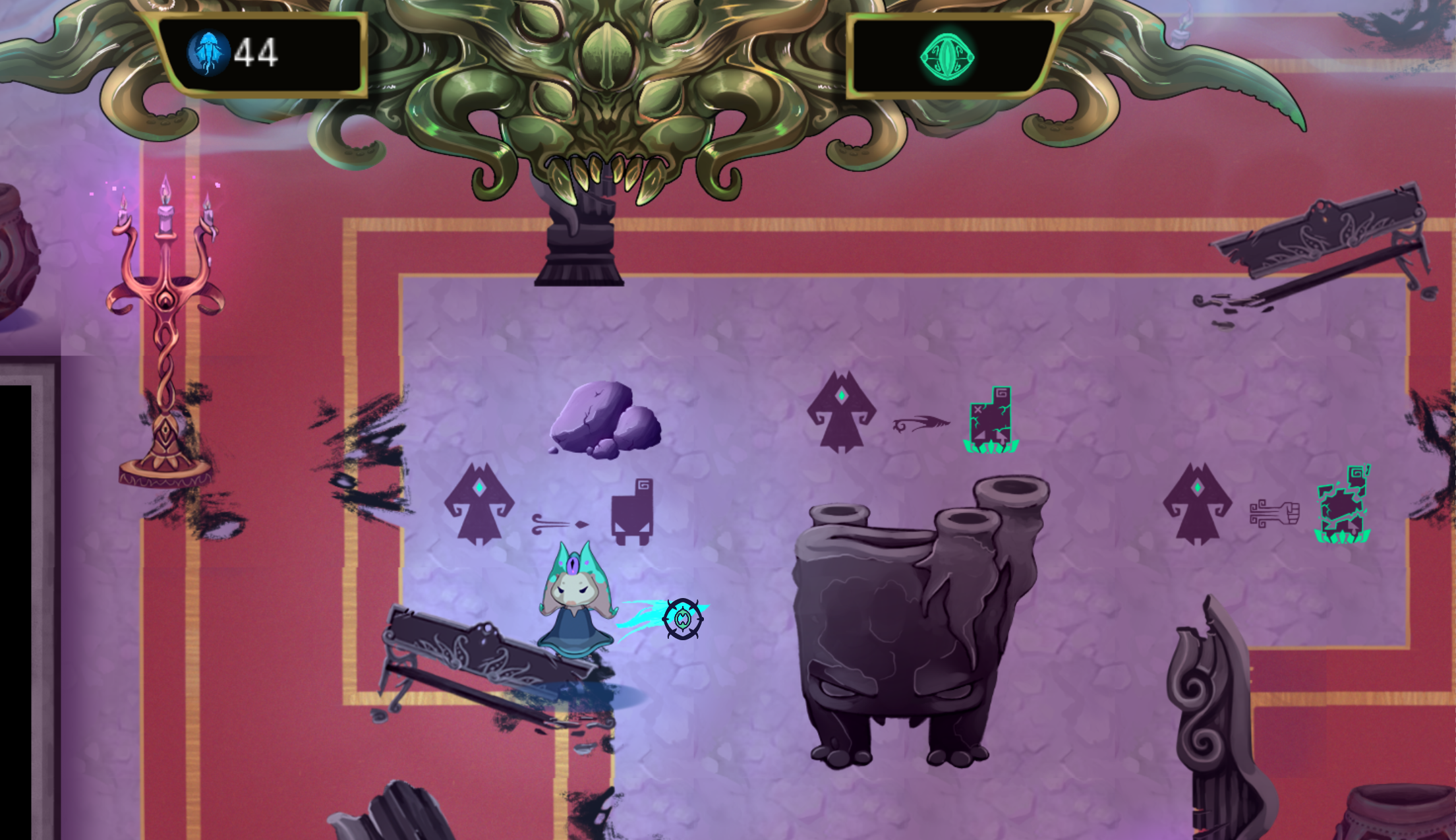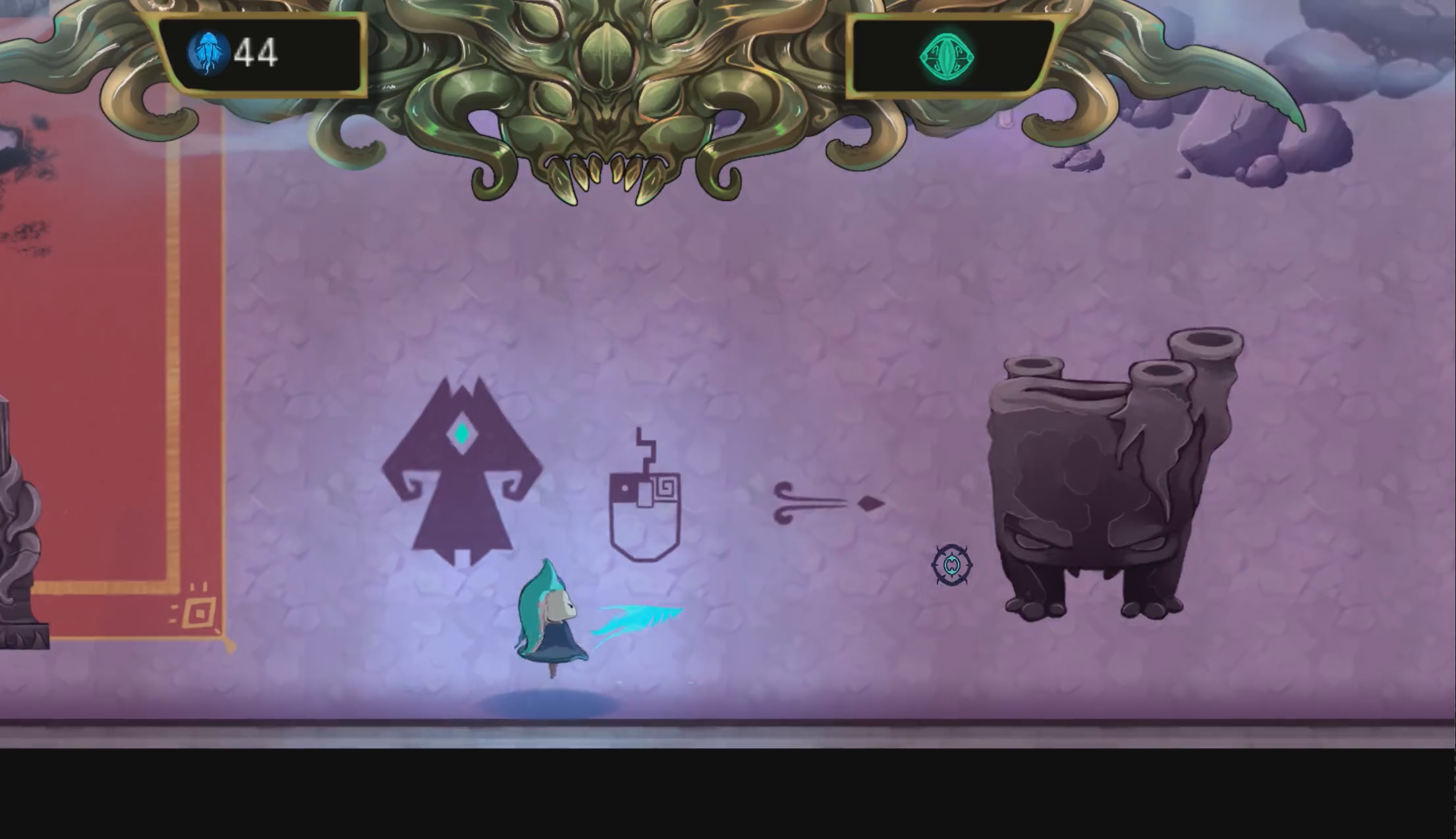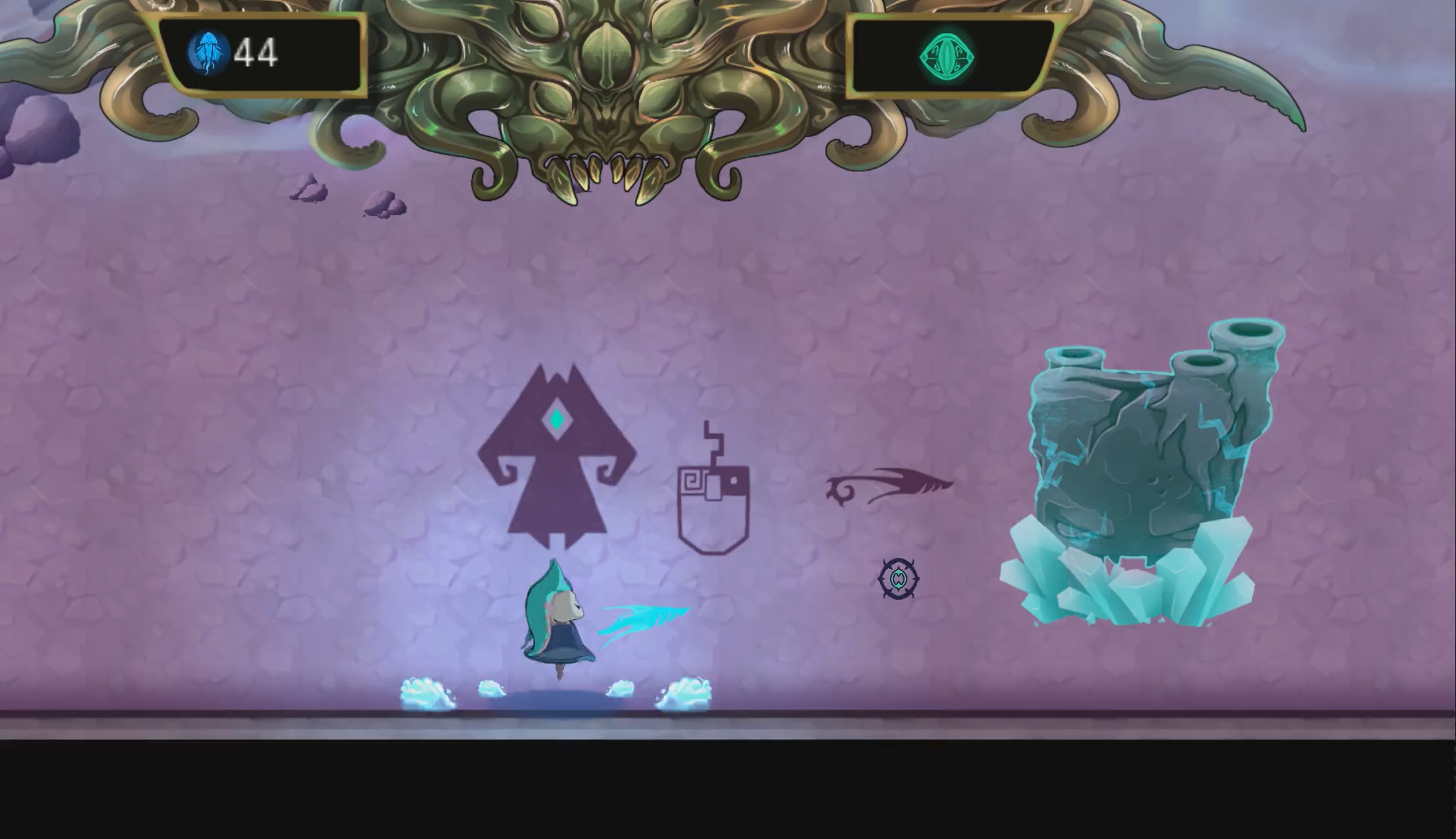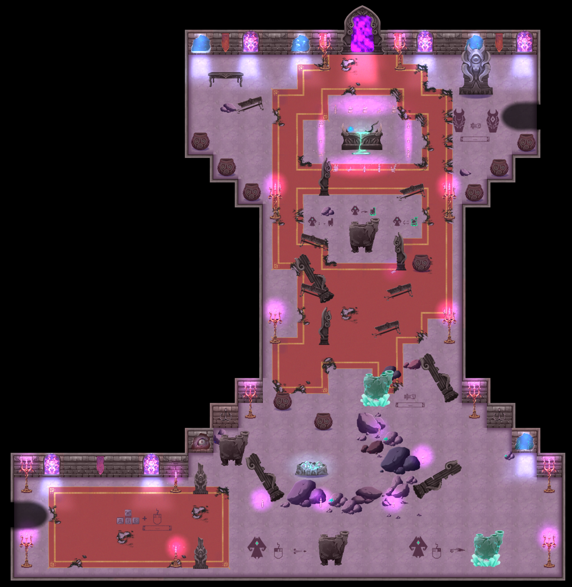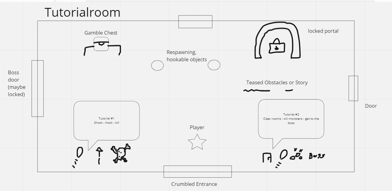 This is an early stage concept for the tutorial room. It shows what and how we were planning to introduce to the player.This is the final tutorial room. The players get introducted to the controls and core mechanics in a simple guided way. This room was playtested the most.