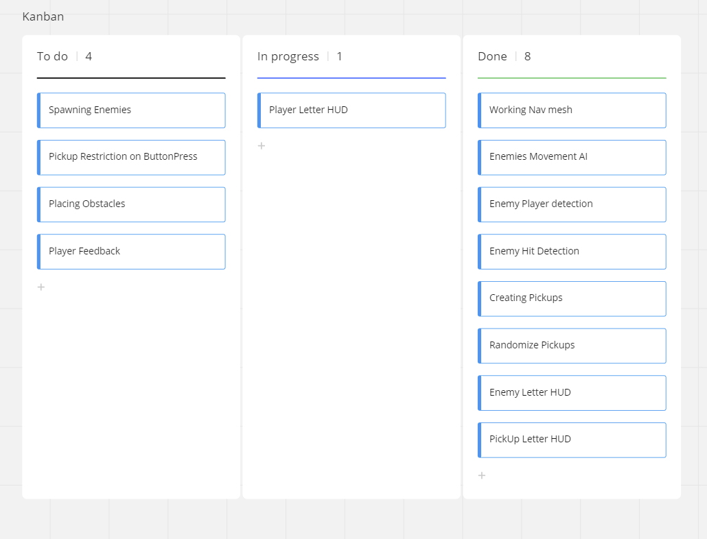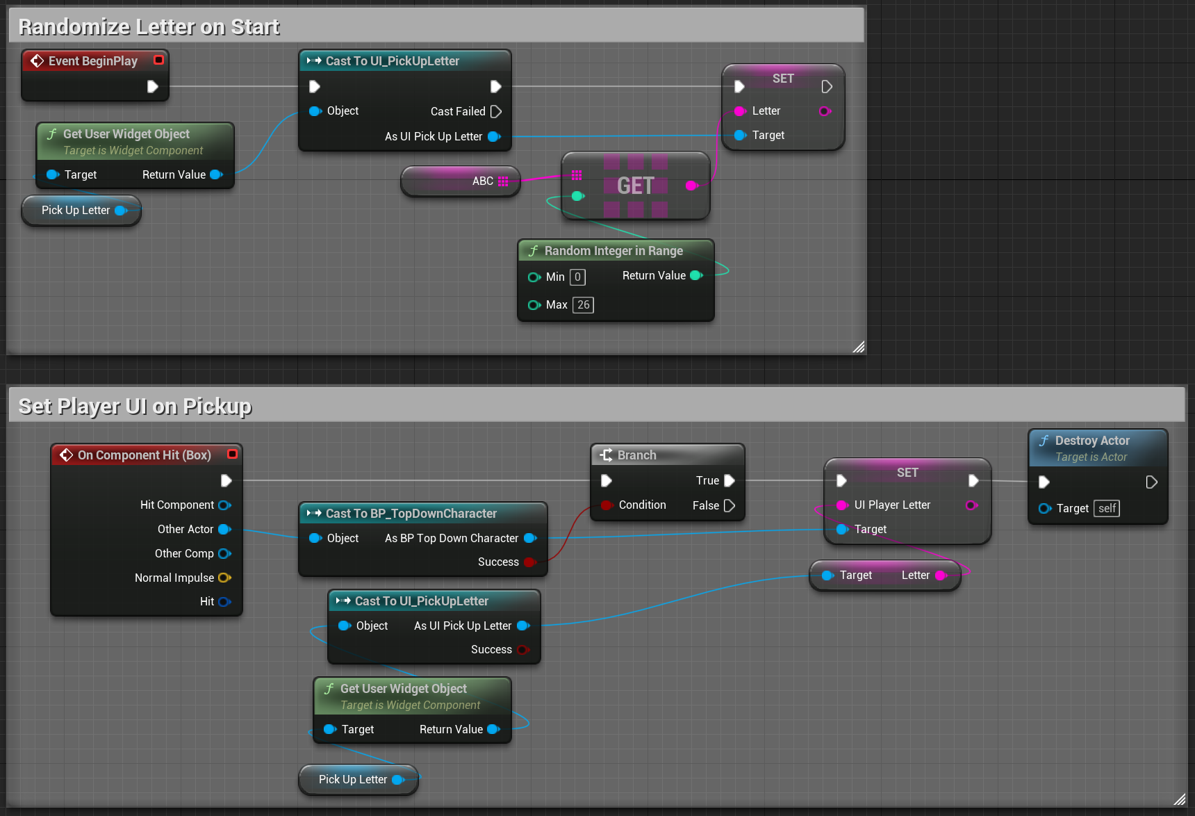 I made a simple enum list to pick random letters for the pickups, so every playthrough is different. Also the player UI had to update on pickup, which I used to learn accessing other BPs.